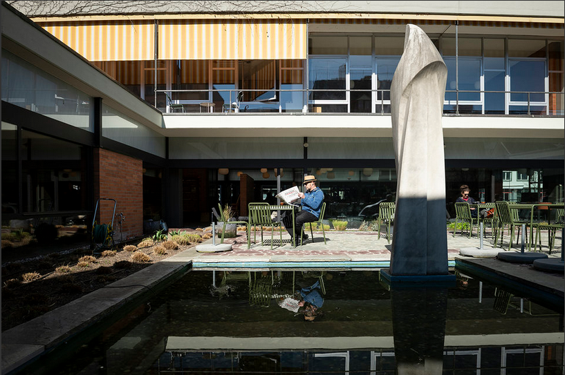 Dans la cour intérieure de la Maison Farel, autre réalisation de l'architecte Max Schlup, cette fois pour la paroisse réformée, avec une préférence pour le béton, l'acier, le verre et... l'eau, dans un bassin qui reflète bien l'esprit du temps, en 1959.