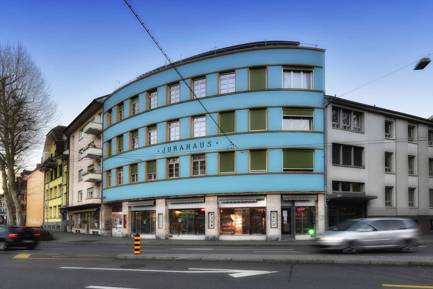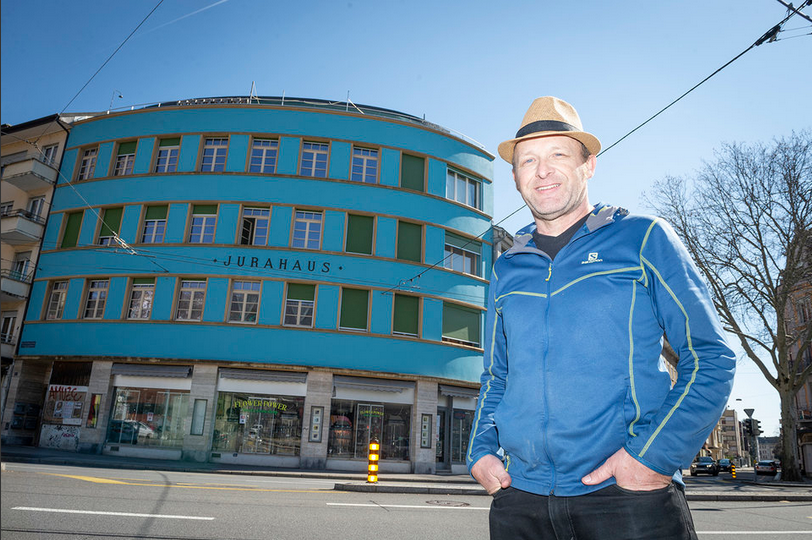 Ton sur ton, devant la ‹Jurahaus› qui a retrouvé en 2015 son bleu original de 1930, de manière à respecter l'héritage culturel plutôt qu'à correspondre aux goûts du jour, dans une ville qui s'est distinguée en ordonnant au propriétaire d'une maison peinte en orange de changer de ton...