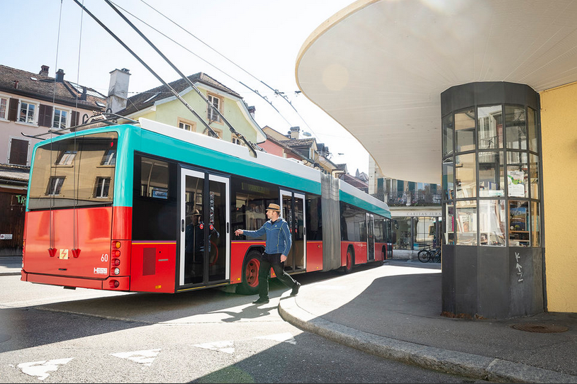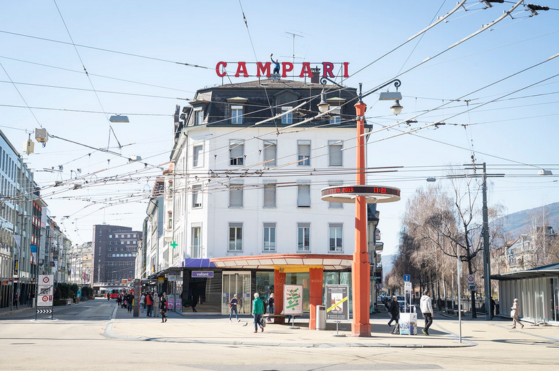 Un abribus appelé champignon, à la place du Jura, avec les courbes chères en 1933 à l'architecte Ernst Berger, avec une cabine téléphonique recyclée en bibliothèque gratuite où chacun peur amener ou emporter un livre en français, en allemand ou dans la langue de son choix.