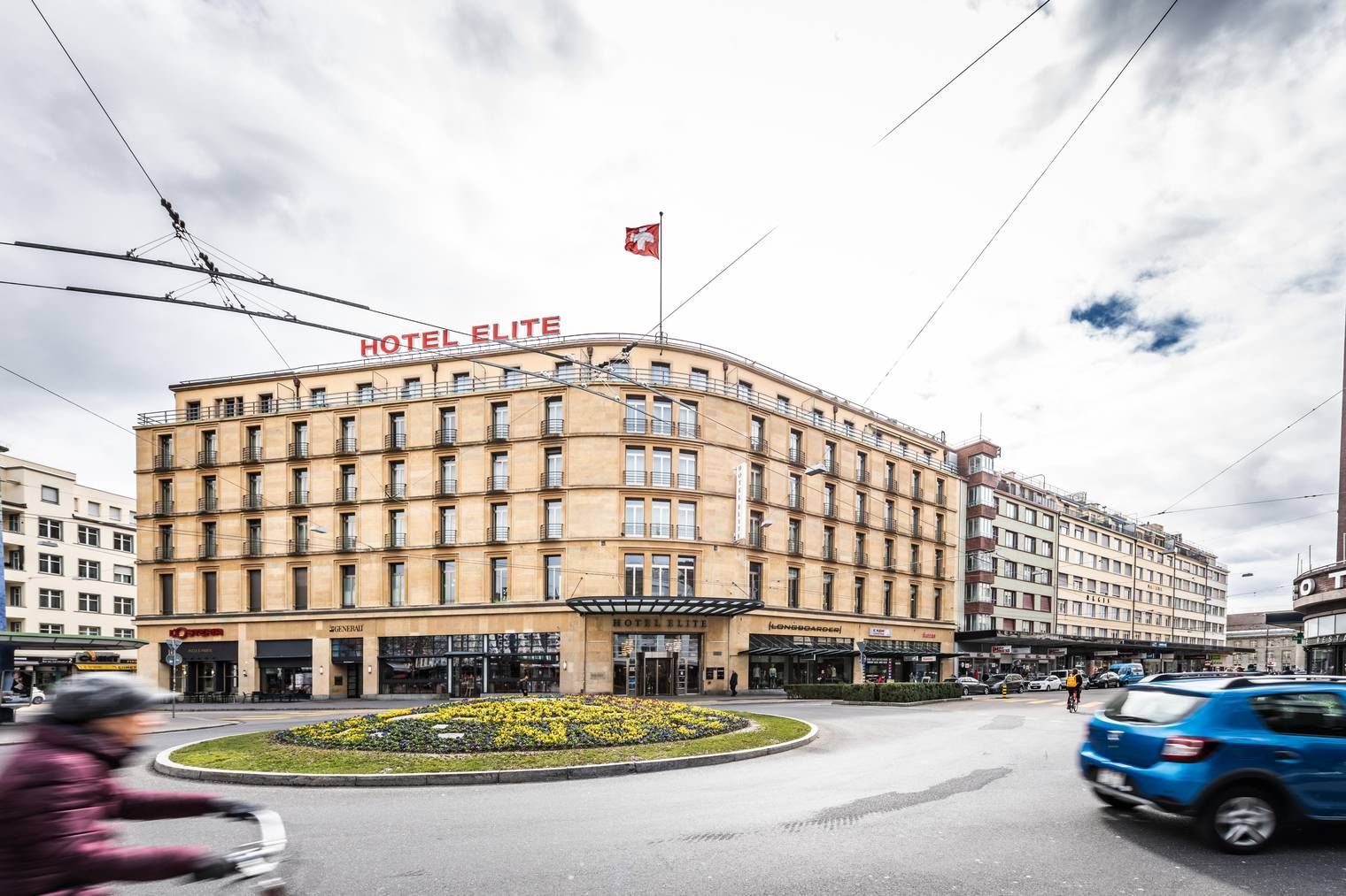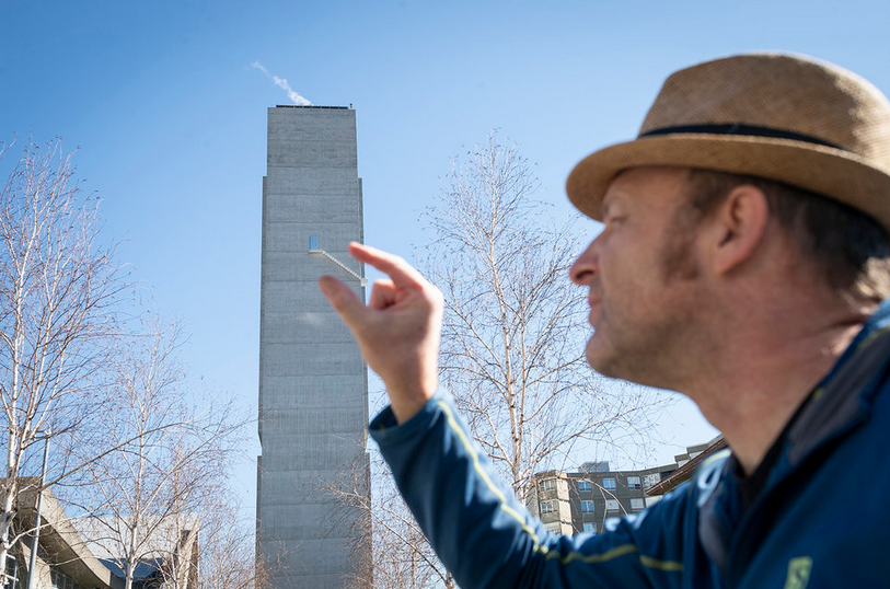 Entre ses doigts, sur la tour du Palais des Congrès construit en 1966 par l'architecte Max Schlup sur le modèle du siège des Nations Unies à New York, on distingue deux portes borgnes reliées par un escalier, sculpture en acier et en aluminium réalisée en 2009 par le duo d'artistes Lang & Baumann.