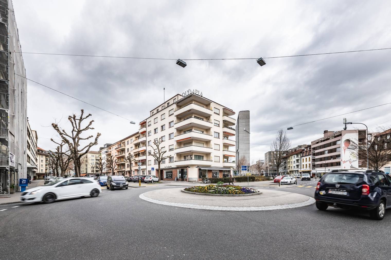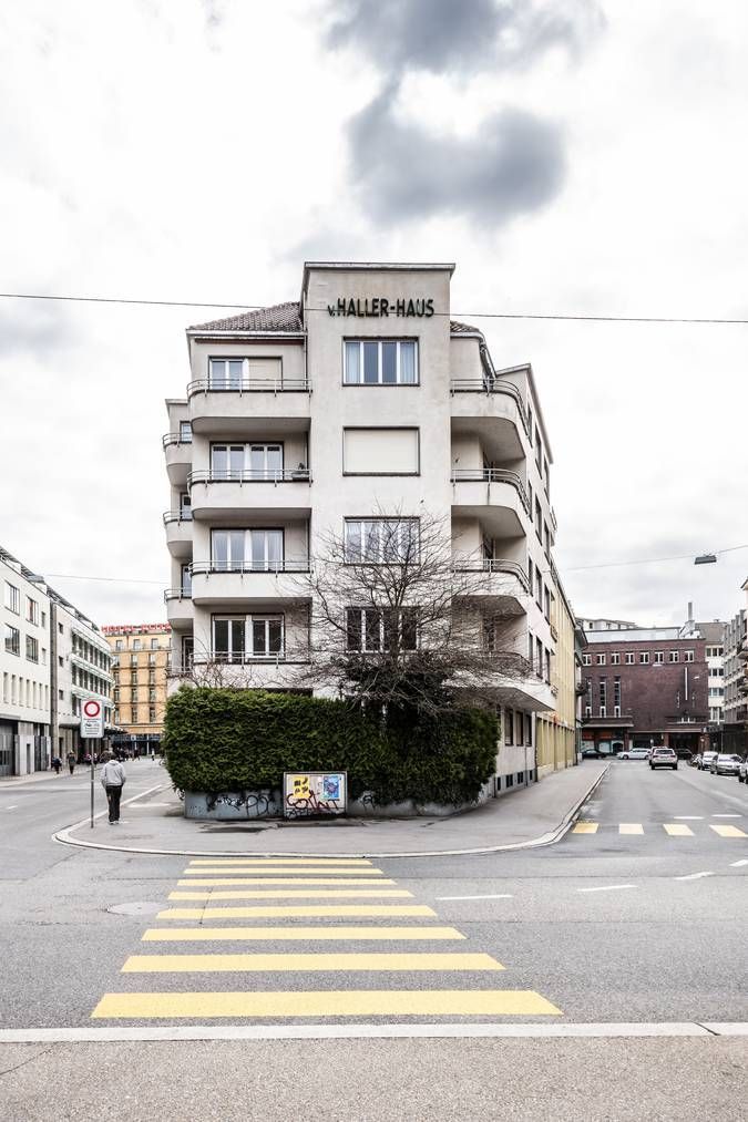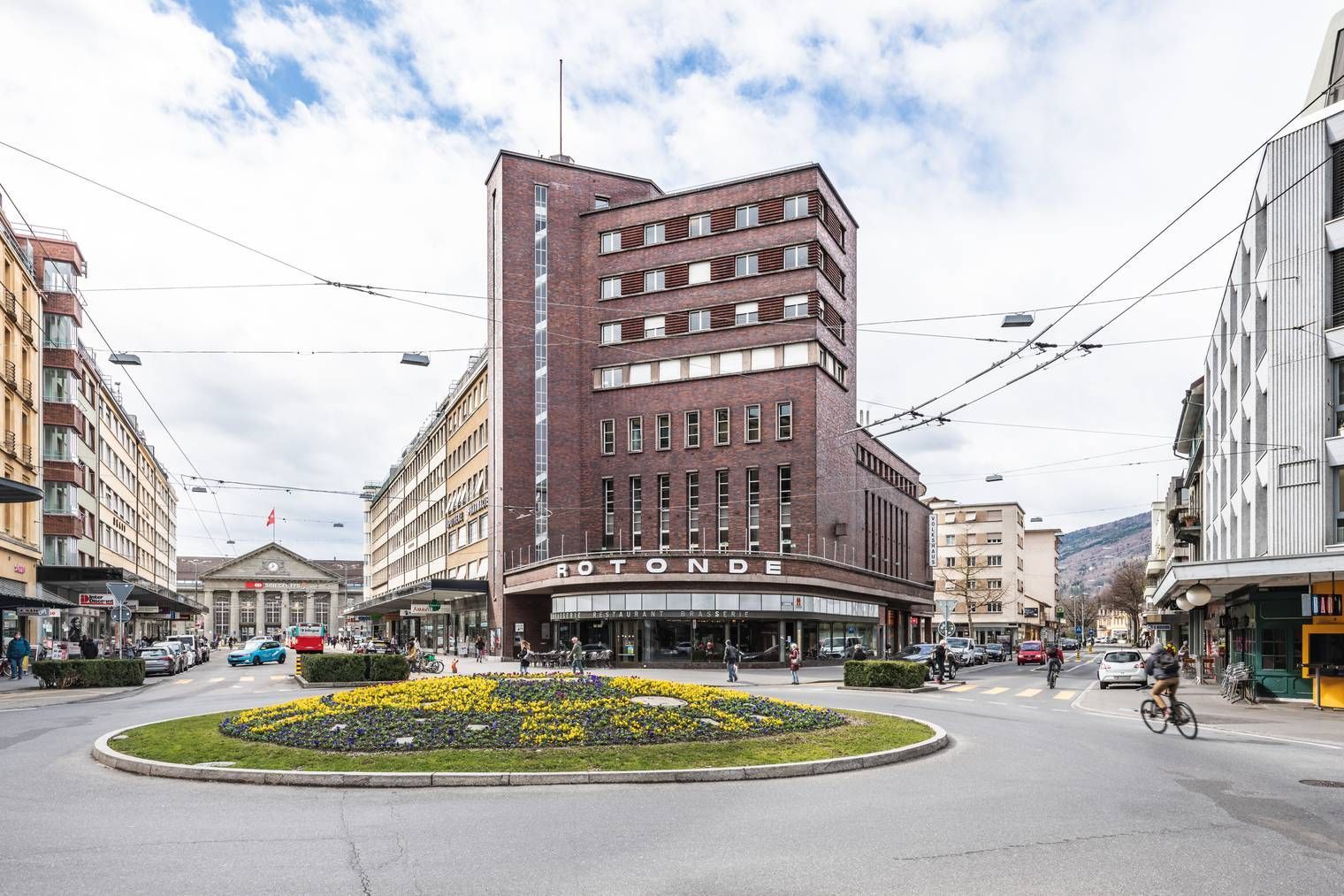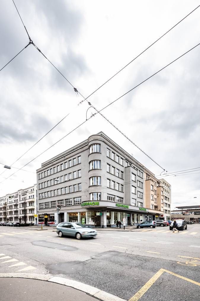 Matthias Grütter travers la rue de la Gare, illustration magistrale du style Bauhaus, avec des appartements aux volumes généreux derrière des façades modestes et au rez-de-chaussée, des commerces qui respectent l'arrondi des vitrines en les mettant en valeur et d'autres pas.