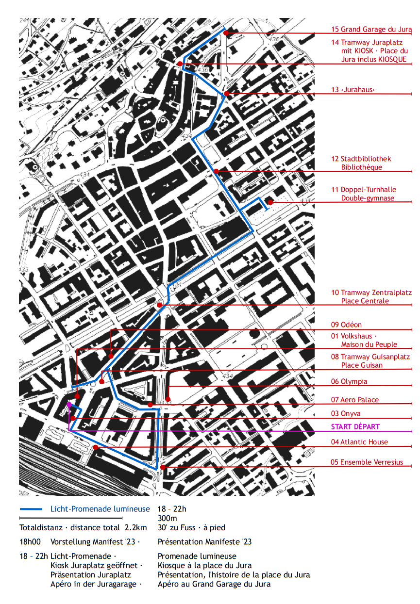 À 18 heures, je présenterai le Manifeste ’23, puis tout le monde pourra se promener individuellement sur la promenade lumineuse jusqu'à 22 heures et voir ainsi des bâtiments comme on ne les voit jamais ailleurs. Tout se passe sans grand effort, les bâtiments parlent d'eux-mêmes. A l'arrivée, près du Grand Garage du Jura, une récompense sera offerte à tous.