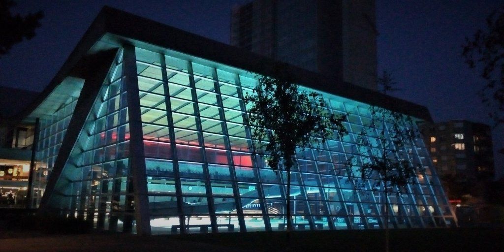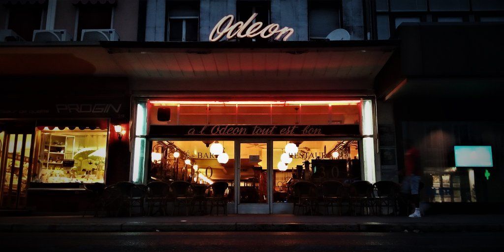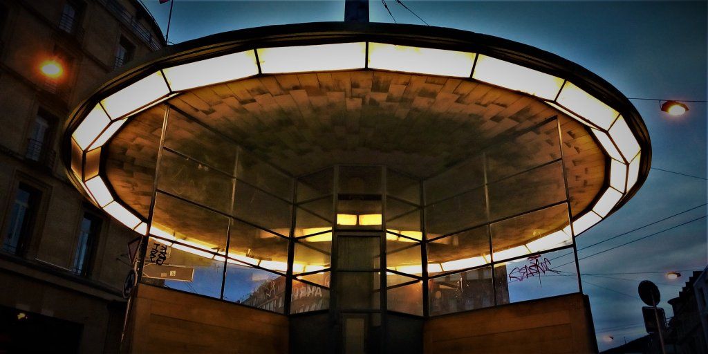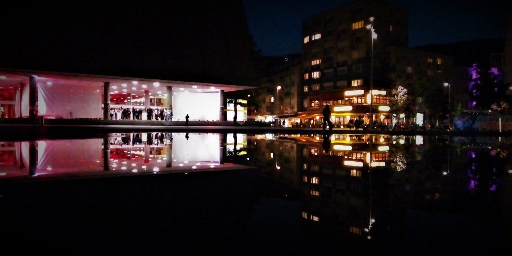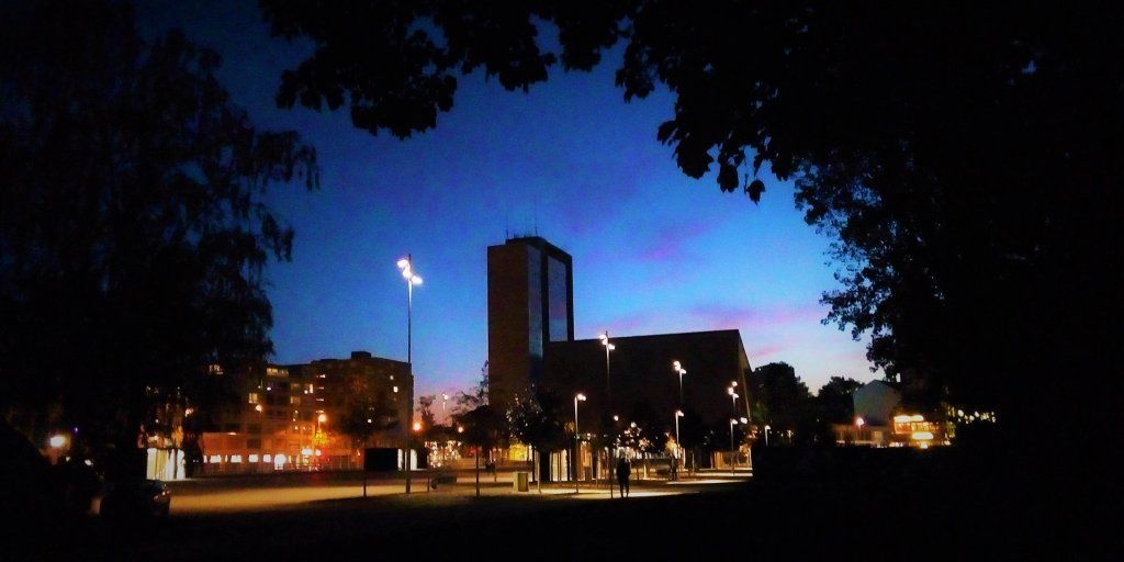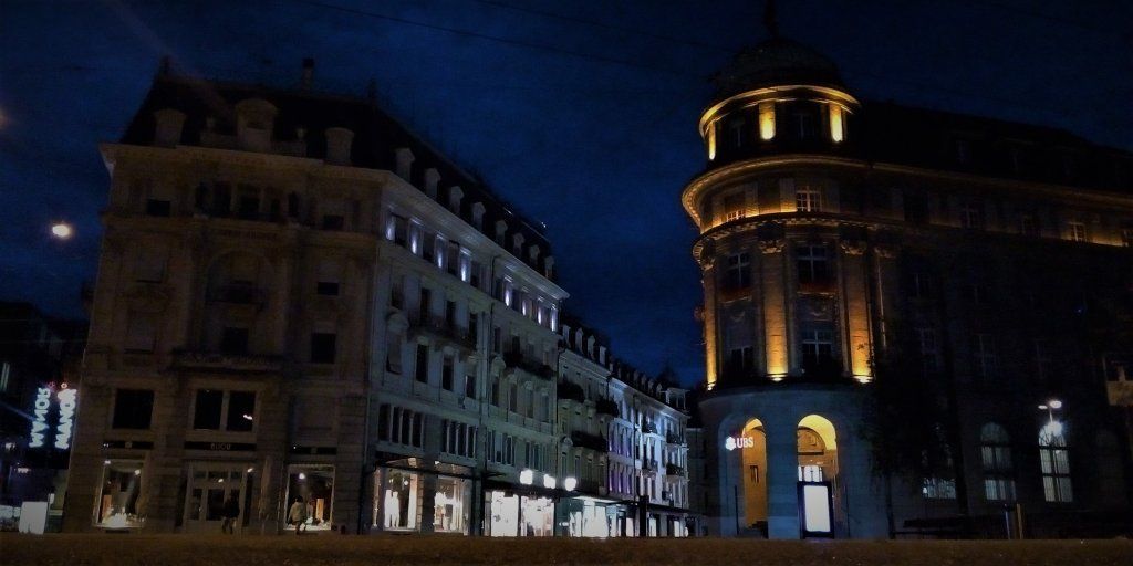 L'heure bleue change l'ambiance dans la ville. Des bâtiments distinctifs disparaissent lentement dans l'obscurité, d'autres détails apparaissent avec la lumière artificielle au premier plan, la vie nocturne urbaine commence.